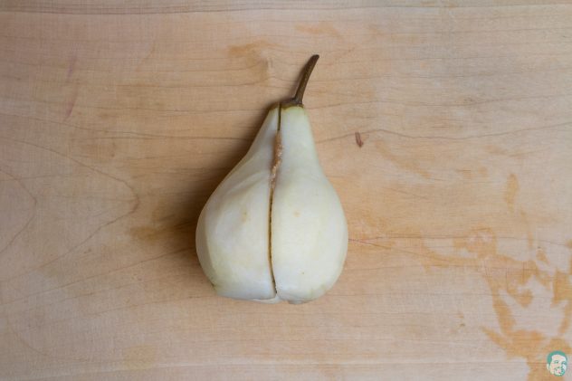 Nun wird die Birne neben dem Stiel halbiert.