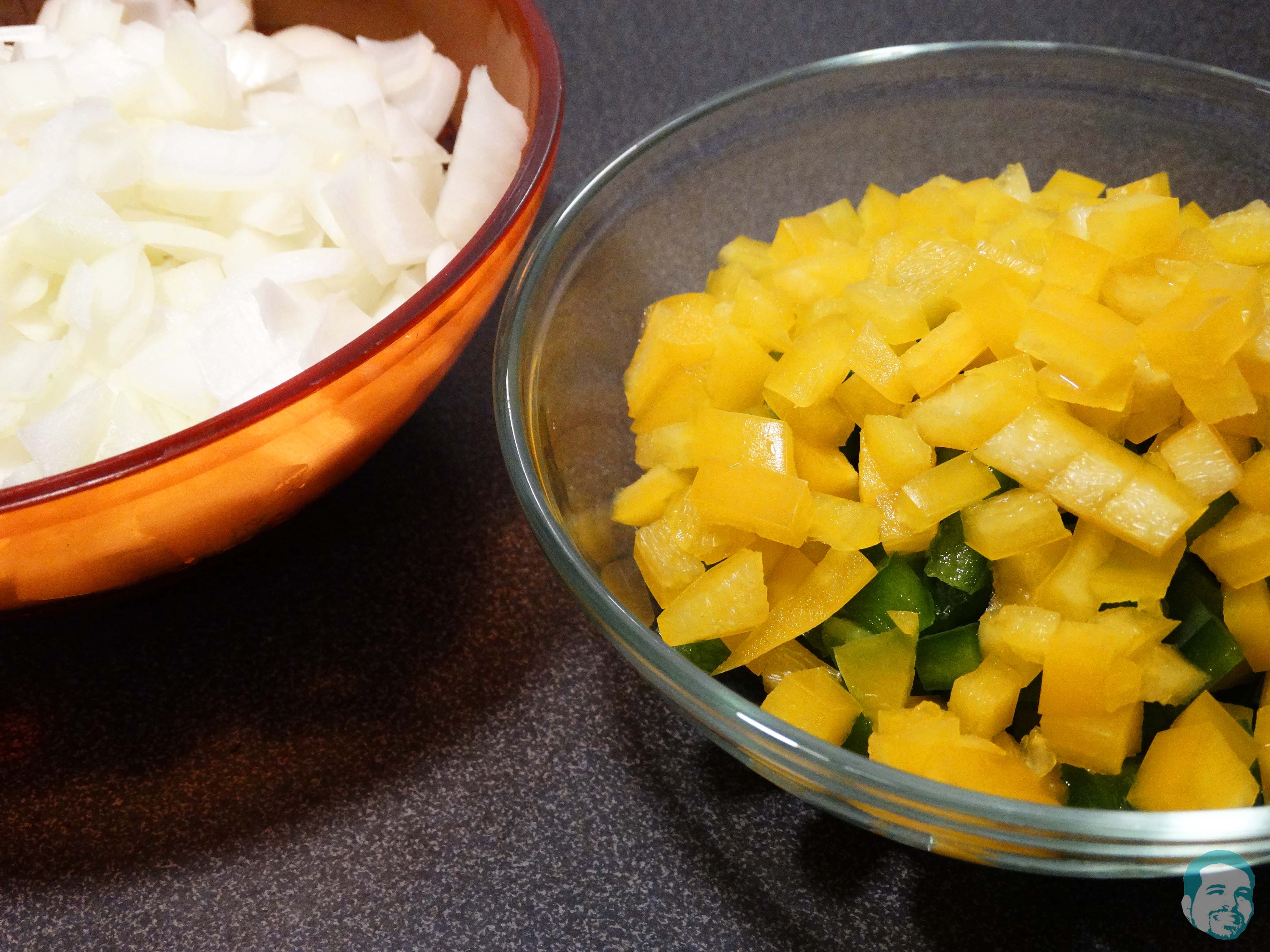 - Zwiebel und Paprika in kleine Stücke schneiden.
