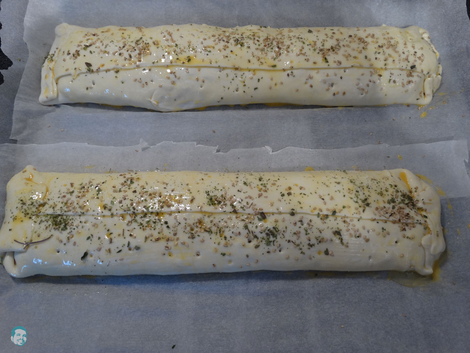Mit dem Ei bestreichen wir unseren herzhaften Bauernstrudel , bestreuen ihn mit Sesam.