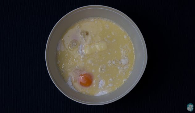 In einem Gefäß die Milch und die Butter zusammen wärmen. Dort rühren wir dann den Trockengerm ein und gießen es zum Mehl.
